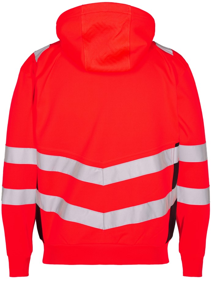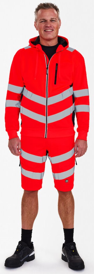 Functional, fluorescent sweat cardigan in a modern, attractive design with stretch lining. Lightly brushed inside, making the fabric soft and comfortable. Reflective zipper at the front. Two spacious side pockets and a chest pocket, each with a zipper. The sweat cardigan has a waffle texture on the front and hood. Ribbed knit at the bottom of the sleeves and hem. Stretchy reflective stripes across the shoulders and around the sleeves and waist. Clothing class 2, tested after 25 washes.
