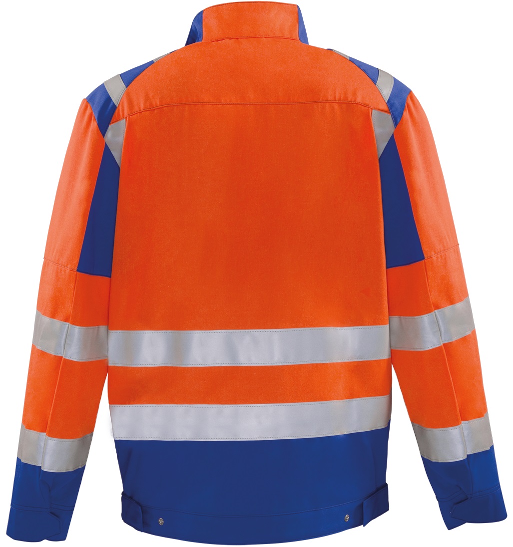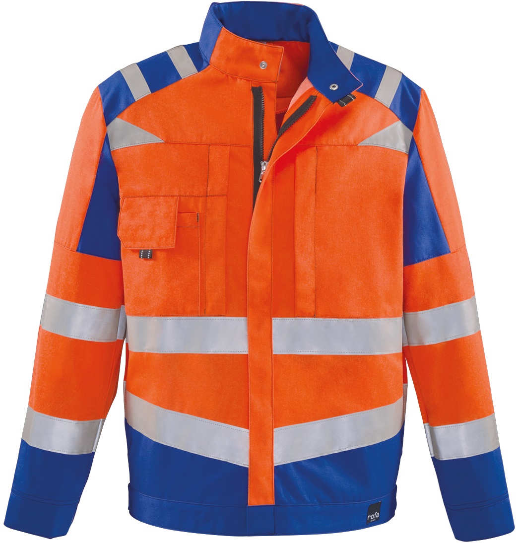 rofa NEWLINE jacket meets the standard for highly visible warning clothing and makes the wearer visible all around even in poor visibility and darkness. The material is particularly tear and abrasion resistant as well as water, oil and dirt repellent. Striking contrasting design elements and intelligently placed reflective stripes create a modern and dynamic appearance. The ergonomic cut, ventilation eyelets and the pleasantly soft material grip ensure a high level of wearing comfort. Innovative pocket solutions offer sufficient storage space and can be used individually.Design: stand-up collar, centre front with zip, front strip with press studs on collar and waistband, 2 breast pockets with Velcro, breast pocket right with patch pocket with flap and Velcro and pen opening, sleeve cuffs width-adjustable by press studs, 2 side pockets, inlaid folds in the back, waistband width-adjustable by press stud, ventilation eyelets, 50mm reflective stripes around torso and sleeves, 25mm reflecti
