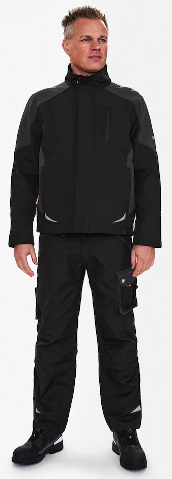 Functional softshell jacket with lots of details. Extended back section. Concealed zipper and Velcro fastener at the front. Reinforced elbows. Soft fleece fabric in the collar. Two spacious slit pockets and chest pocket, all with zippers. Two large inside pockets with Velcro fastener. Also inside pockets with zipper and divided pocket, e.g. for pens. Reflective stripes on the shoulders, front and back for increased visibility.