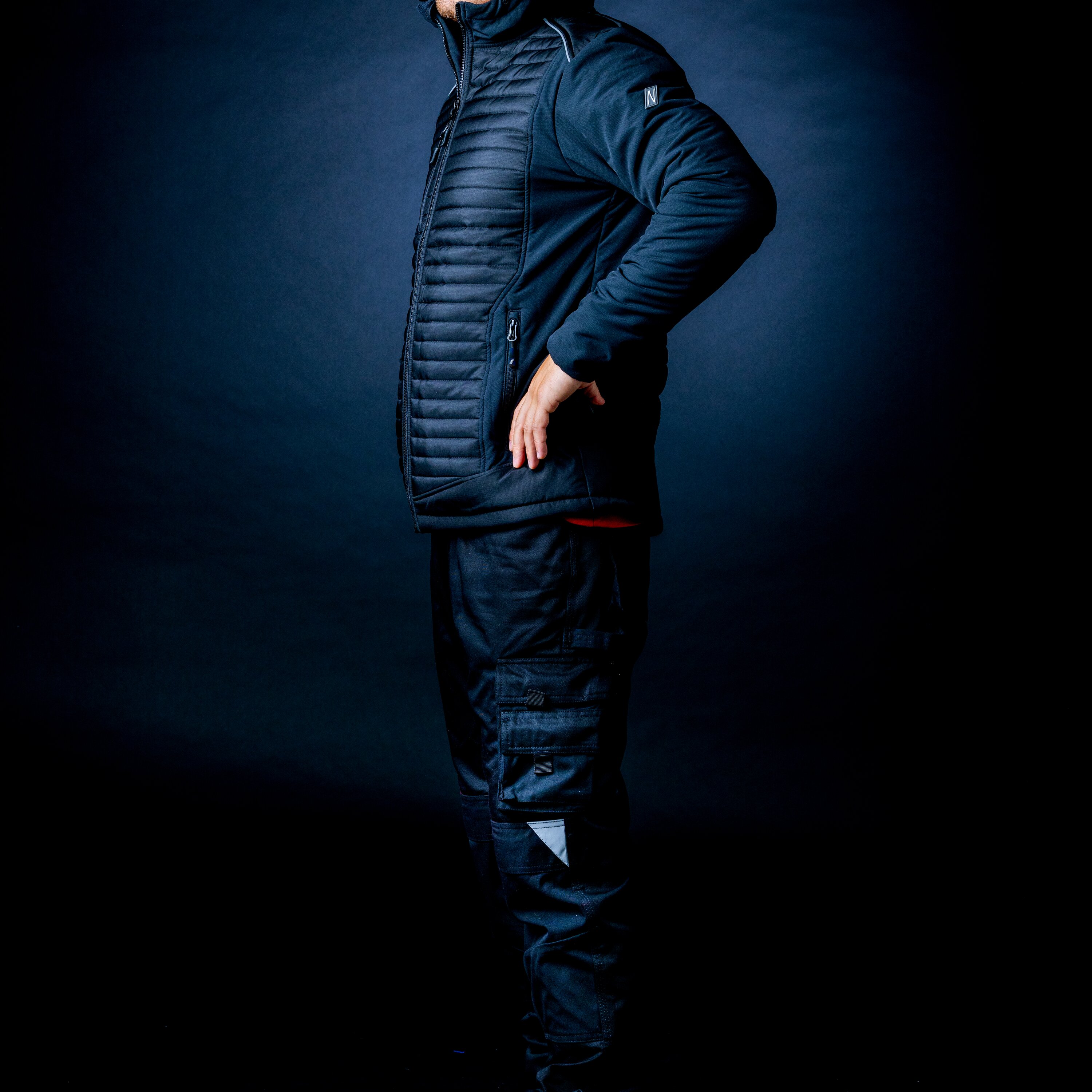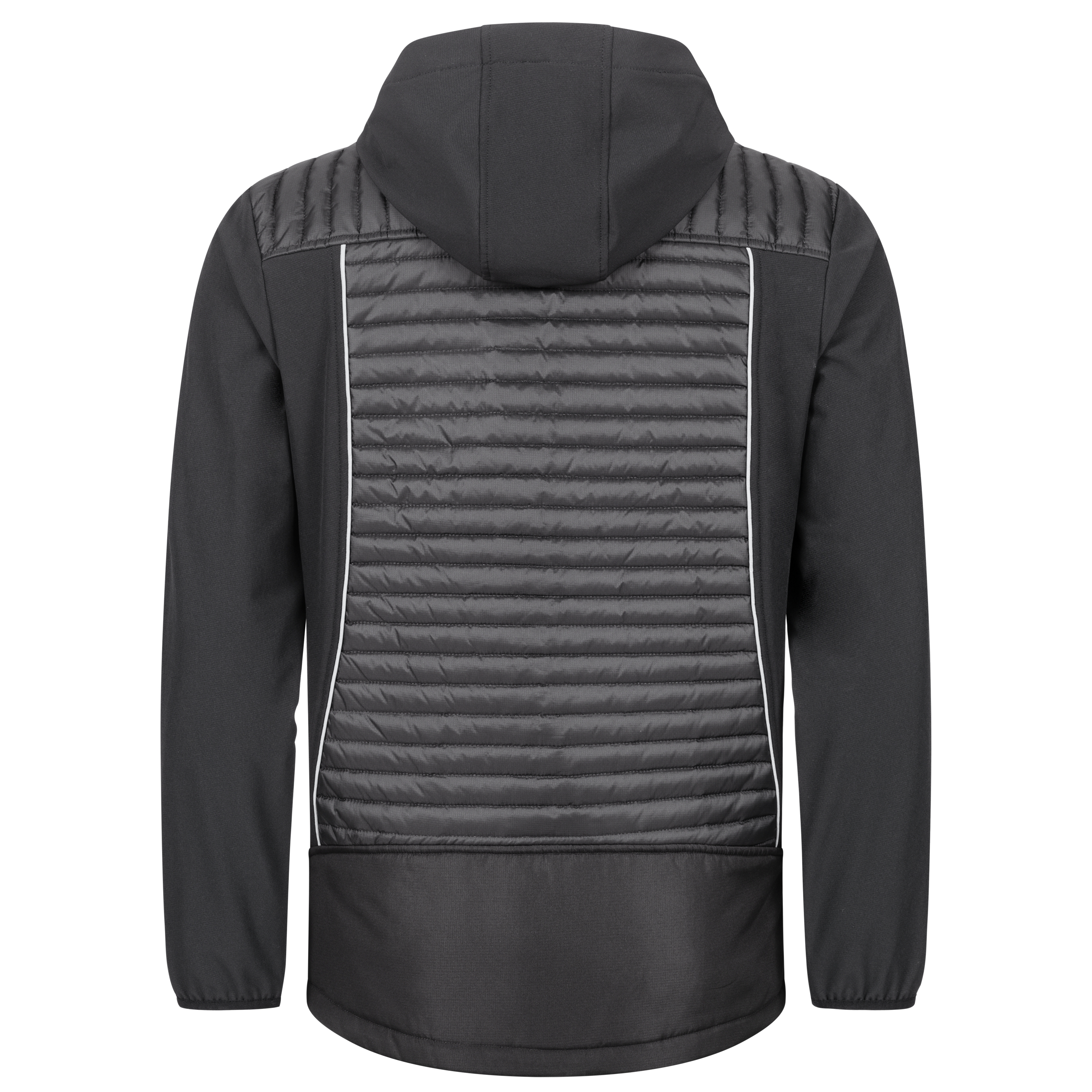 NITRAS MOTION TEX PLUS, quilted softshell jacket, black (color code: 1000), 340 gsm, comfortable to wear thanks to extended back, elasticated cuffs and drawstring in the hem for optimum support and fit, sporty design, quilting on the front and back, extra warming, reflective piping for improved visibility, stand-up collar, full-length YKK zipper with double-layer windstopper inside, chest pocket, side pockets, hood with drawstring for optimum fastening, regular fit