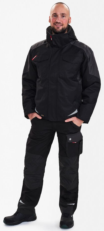 Waterproof, breathable pilot jacket with high collar and extended back. Concealed zipper and Velcro fastener at the front. Two large zippered front pockets. Two large breast pockets with flap. Napoleon pocket with zipper on the left side. Two spacious inside pockets for storing documents and an inside pocket with zipper for a cell phone. Detachable hood. Adjustable wind cuffs at the waist and knitted cuffs on the sleeves and collar for better wind protection. Reinforced elbows for greater wear resistance. Reflective stripes on the shoulders, front and back for increased visibility. Taped seams. Zipper in the lining (option to add print/embroidery).