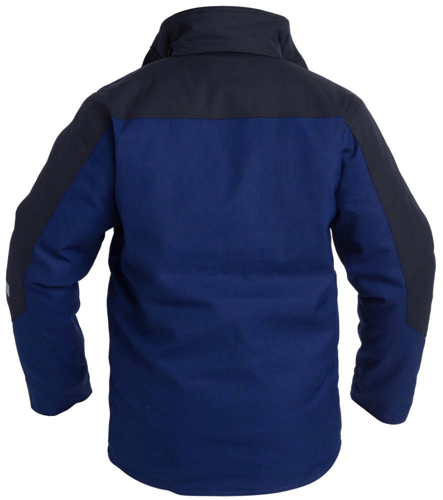 Winter jacket with double button placket, concealed press studs and metal zipper at the front. Chest pockets with flap and Velcro fastening, both with cell phone pocket. Two inside pockets with zipper. Two side pockets with flap and Velcro fastening. The jacket is equipped with a flame-retardant quilted lining and a membrane to prevent water penetration. Practical details on pockets and seams prevent sparks from getting caught. Antistatic, flame-retardant and protects against aerosols, spray and light splashes of chemicals.