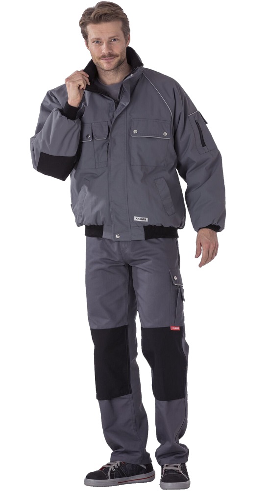 waterprooferdi, glued seams, fleece collar, reflective piping on shoulders and pocket flaps, arm bends with Cordura® set off, hood in collar, patch mobile phone pocket right, 2 side pockets, 2 breast pockets with flap and press studs to close, sleeve pocket left, inside pocket with velcro closure, inside lining quilted, concealed front zip, knitted cuffs and waistband.