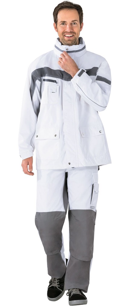 Breathable, waterprooferdi, glued seams, fleece collar, reflective piping as safety feature, hood in collar, 1 breast pocket on left with flap and Velcro fastener, double breast pocket on right, mobile phone pocket on right breast, 2 pen pockets, 2 side pockets, 2 patch side pockets, sleeve pocket on left, document pocket under front flap, mesh lining inside, concealed front zip, adjustable cuffs with Velcro fastener.