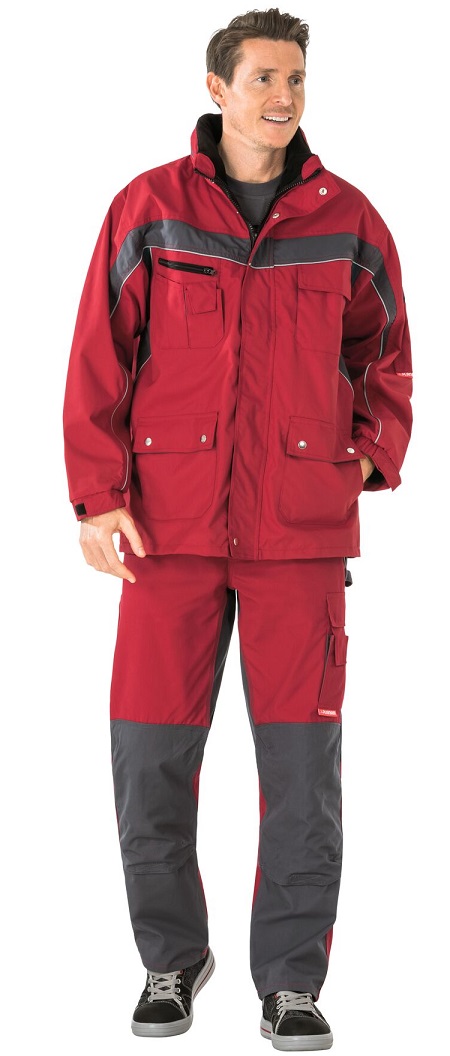 Breathable, waterprooferdi, glued seams, fleece collar, reflective piping as safety feature, hood in collar, 1 breast pocket on left with flap and Velcro fastener, double breast pocket on right, mobile phone pocket on right breast, 2 pen pockets, 2 side pockets, 2 patch side pockets, sleeve pocket on left, document pocket under front flap, mesh lining inside, concealed front zip, adjustable cuffs with Velcro fastener.