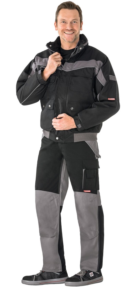 Breathable, waterprooferdi, glued seams, fleece collar, reflective piping as safety feature, hood in collar, 1 breast pocket left with flap and Velcro fastener, double breast pocket right, mobile phone pocket on right breast, 2 pen pockets, 2 side pockets, 2 patch side pockets, sleeve pocket on the left, document pocket under the front flap, quilted lining, concealed front zip, knitted cuffs on hem, elastic sleeve cuffs adjustable with Velcro.