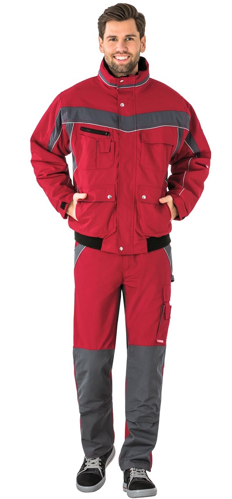Breathable, waterprooferdi, glued seams, fleece collar, reflective piping as safety feature, hood in collar, 1 breast pocket left with flap and Velcro fastener, double breast pocket right, mobile phone pocket on right breast, 2 pen pockets, 2 side pockets, 2 patch side pockets, sleeve pocket on the left, document pocket under the front flap, quilted lining, concealed front zip, knitted cuffs on hem, elastic sleeve cuffs adjustable with Velcro.