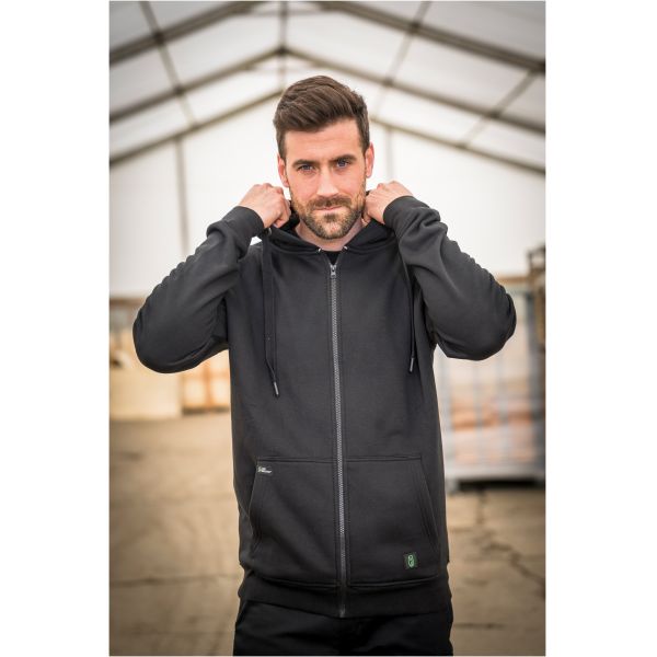 Classic Line bodyguard made of classic sweat fabric, unisex cut, tone-in-tone seams, quality front zip and underlap with chin guard, two-piece hood made of double-layer fabric, with metal eyelets, width-adjusting drawstring on hood with flat straps, neckline with neck tape, inside hanger, set-in sleeves, 6 cm wide ribbed hem and cuffs, side seams, washable at 60 °C and suitable for tumble drying.
