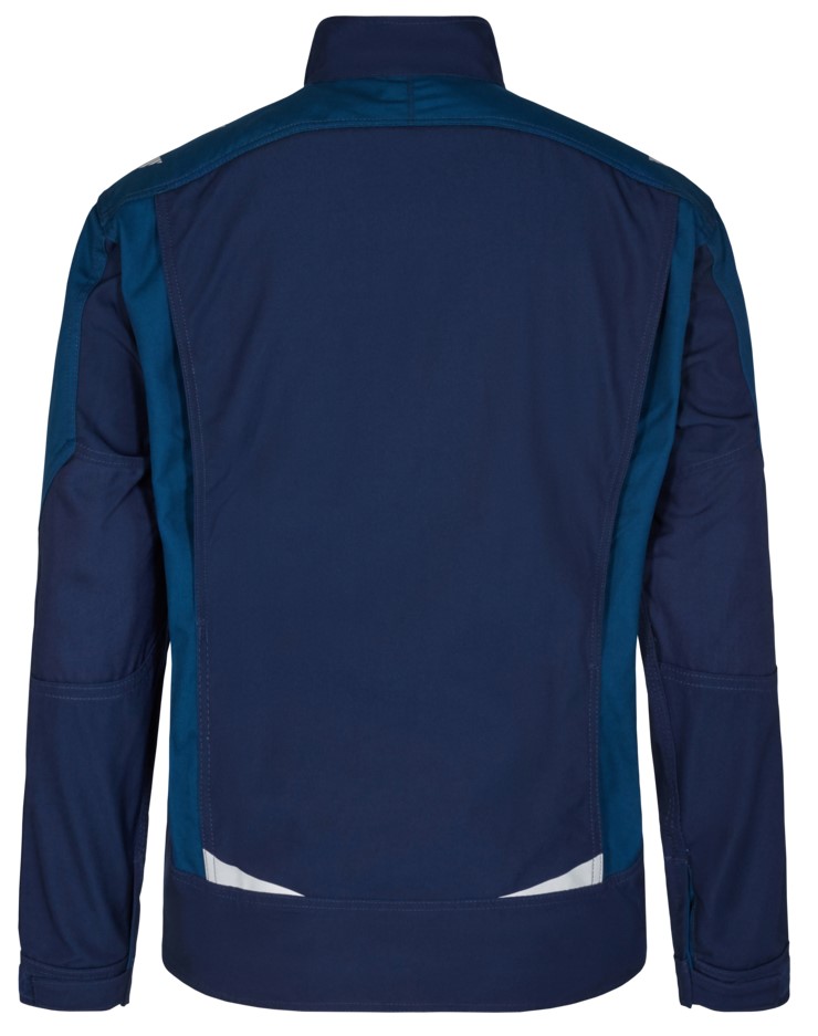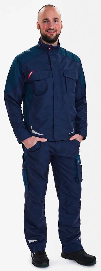 Functional work jacket with many details. Extended back section with movement pleat. Concealed zipper at the front. Reinforced elbows. Two spacious slit pockets. Two breast pockets with flaps - the right one with a loop and D-ring for attaching an ID card, the left one with an additional zipped pocket for a cell phone. Two large inside pockets with Velcro fastener. Adjustable cuffs. Reflective stripes on the shoulders, front and back for increased visibility. Suitable for industrial laundering.