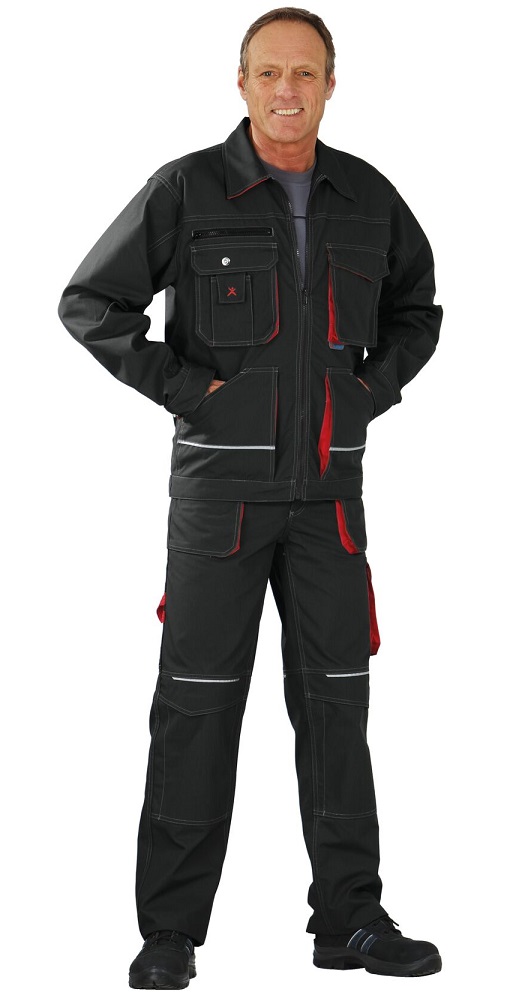 2 patch side pockets, 1 breast pocket left with flap and Velcro fastener, double breast pocket right, mobile phone pocket on the right breast, adjustable cuffs with press stud, turn down collar, waist width adjustable with press stud, 2 golf pleats in the back, reflective piping in the front and back area as safety equipment.