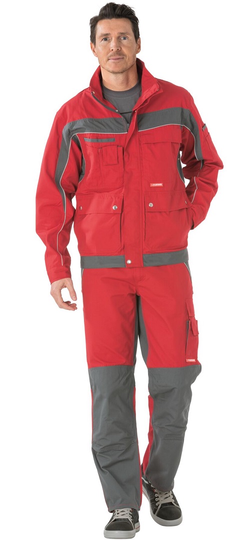 2 patch side pockets with flap and press studs, 1 breast pocket left with flap and Velcro fastener, double breast pocket right, mobile phone pocket on the right breast, 2 pen pockets, adjustable cuffs with press stud, concealed front zip, stand-up collar, adjustable waistband with Velcro tape, sleeve pocket left, reflective piping as safety equipment, 2 golf pleats in the back, ventilation slit in the back.