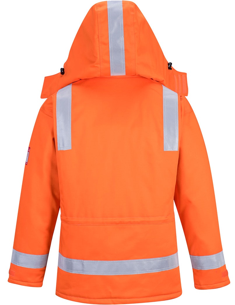 This flame retardant winter jacket is ideal for the offshore industry. Made from the same outer fabric as FR50, combined with thick insulation padding for extra heat. With double stitched reflective stripes on arms, body and shoulder. Conforms to all required EN standards, including the welding protection standard. With triple seams, concealed 2-way brass zipper and two diagonal breast pockets with flap. With drawcord for optimum fit and detachable hood.Flame retardant This industry-leading collection offers multi-standard protection for potentially explosive atmospheres. These state-of-the-art products are the result of many years of experience, state-of-the-art technology and market research. A commitment to the health, safety and comfort of the wearer can be seen in the wide range of products suitable for all weather conditions and applications.Product features:	Standards EN ISO 11612 (A1+A2 B1, C1, E2, F1) EN 1149 -5 EN 342 (0.451m2.K/W(B) X,2,X) EN ISO 11611 Class 2 (A1+A2) 	CE c