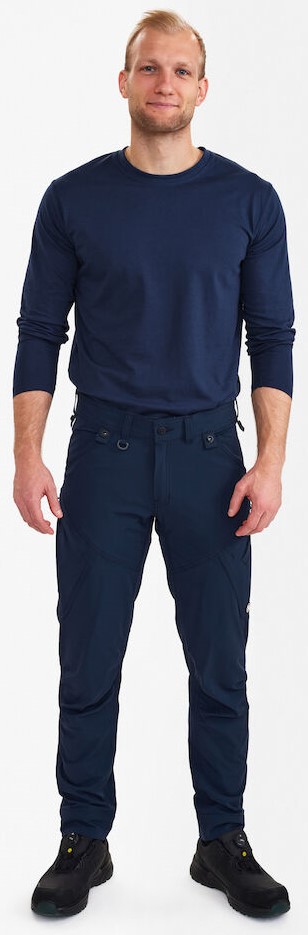 Functional service trousers with many functional details. The fabric is equipped with comfortable 4-way stretch for a better fit and more freedom of movement and with cotton on the inside for maximum comfort. The trousers have an ergonomically shaped knee area. Two spacious slanted front pockets. Two back pockets. Two thigh pockets with zippers. The left thigh pocket has an additional cell phone pocket. The right thigh pocket has pleats for extra width and an inside pocket. D-ring at the front for attaching ID cards, for example. Wide bottom hem that can be left out if extra leg length is required. Only one seam needs to be undone to lengthen the trousers. The trouser leg is still hemmed.