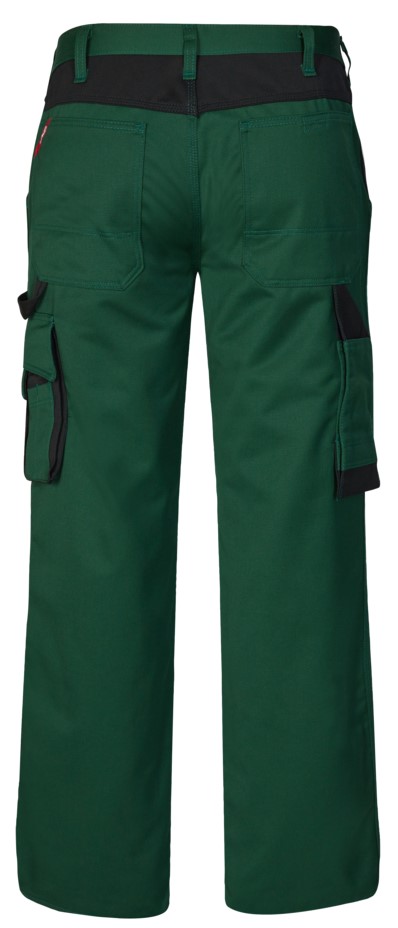Work trousers with triple topstitching and pleats. Two slit pockets and one coin pocket. Fly with metal zipper. Dark-colored metal trouser button. Two reinforced back pockets, the right one with Velcro fastening. Reinforced folding rule pocket with expansion pleat on the right. Thigh pocket and cell phone pocket with stretch pleats and flap with Velcro fastening and additional pencil pockets on the left/hammer loop on the left. Knee pockets/knee reinforcement with Velcro fastener and two adjustment options for inserted knee pads. Suitable for industrial laundering.