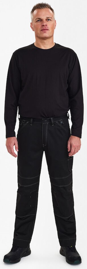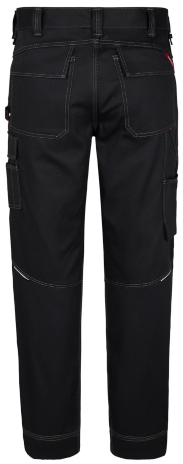 Functional craftsman trousers with contrasting topstitching. Optimum fit, ergonomically shaped knees. Two spacious, slanted slit pockets at the front. Two back pockets with flap. Thigh pocket with flap and inserts for pens, for example. Free-hanging, reinforced folding rule pocket with extra compartments guarantees optimum freedom of movement. Adjustable hammer loop. Reinforced knee pockets with two adjustment options for knee pads. Reinforced hem on trouser legs for extra wear resistance. High visibility thanks to reflective piping in the middle of the back of the trouser legs. The pants have an extra wide turn-up so that the crotch length can be extended if required. For additional leg length, only one hem needs to be unzipped, behind which there is an additional hem.