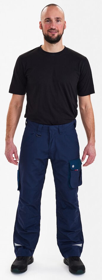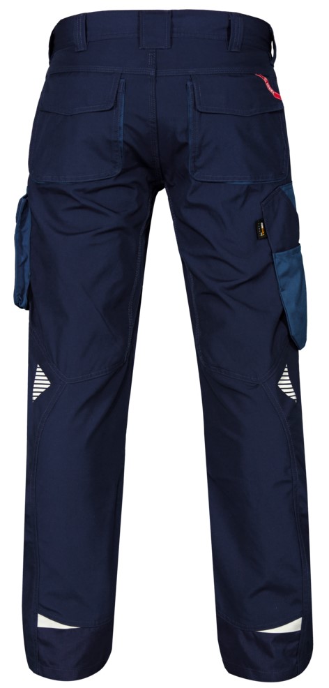 Functional work trousers with many details. Optimum fit, including ergonomically shaped knees and a panel on the inseam in the crotch for greater comfort. Two spacious, slanted slit pockets at the front. Loop with D-ring (front) for attaching an ID card. Two spacious back pockets with flap and Velcro fastener. Thigh pocket with zipper pocket for cell phone, additional small pocket. It is spacious and provides more freedom of movement thanks to the free-hanging bottom. Reinforced ruler pocket at the bottom with additional compartments. The ruler pocket also has a free-hanging bottom. Knee reinforcement/knee pocket with Velcro fastener at the bottom and two adjustment options for knee pads. Reinforced hem at the back and front of the trouser legs for extra wear resistance. Reflective strips on the knees and at the bottom of the trouser legs for increased visibility. Suitable for industrial laundering.