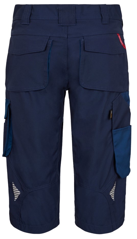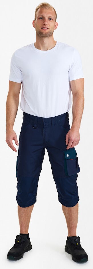 Functional 3-4 trousers with many details. Optimum fit, including ergonomically shaped knees and a panel on the inseam in the crotch for greater comfort. Two spacious, slanted slit pockets and two holster pockets at the front. Loop with D-ring (front) for attaching an ID card. Two spacious back pockets with flap and Velcro fastener. Thigh pocket with zipper pocket for cell phone, additional small pocket. It is spacious and provides more freedom of movement thanks to the free-hanging bottom. Reinforced ruler pocket at the bottom with additional compartments. The ruler pocket also has a free-hanging bottom. Knee reinforcement/knee pocket with Velcro fastening at the bottom and two adjustment options for knee pads. Suitable for industrial laundering.