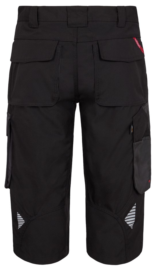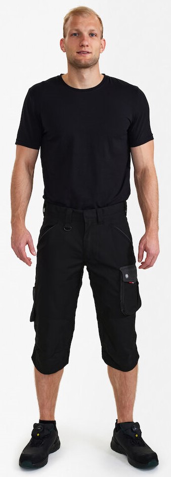 Functional 3-4 trousers with many details. Optimum fit, including ergonomically shaped knees and a panel on the inseam in the crotch for greater comfort. Two spacious, slanted slit pockets and two holster pockets at the front. Loop with D-ring (front) for attaching an ID card. Two spacious back pockets with flap and Velcro fastener. Thigh pocket with zipper pocket for cell phone, additional small pocket. It is spacious and provides more freedom of movement thanks to the free-hanging bottom. Reinforced ruler pocket at the bottom with additional compartments. The ruler pocket also has a free-hanging bottom. Knee reinforcement/knee pocket with Velcro fastening at the bottom and two adjustment options for knee pads. Suitable for industrial laundering.