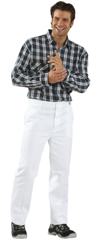 round waistband with 7 loops, fly buttoned, 2 set-in front pockets, 1 reinforced back pocket, 1 ruler pocket.