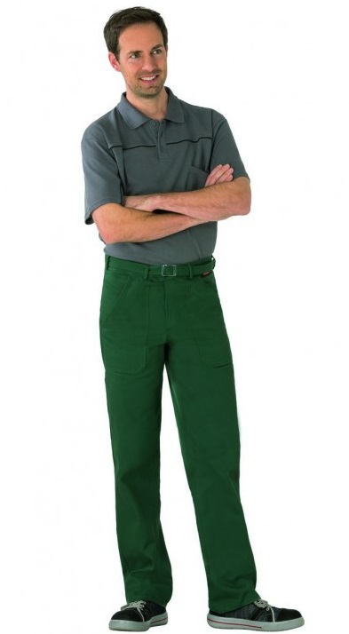 cotton for best wearing comfort! Round waistband with 7 loops, belt with metal buckle, fly with zipper, 2 patch front pockets, reinforced, 1 back pocket, 1 ruler pocket.