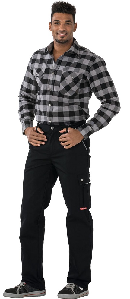 2 set-in pouch pockets, right double ruler pocket, reflective piping at the pocket openings and the pocket flaps, left thigh pocket with flap and press studs, attached mobile phone pocket, elasticated waistband, right 1 reinforced hip pocket, round waistband with 7 belt loops and jeans button, zipper in trouser fly.