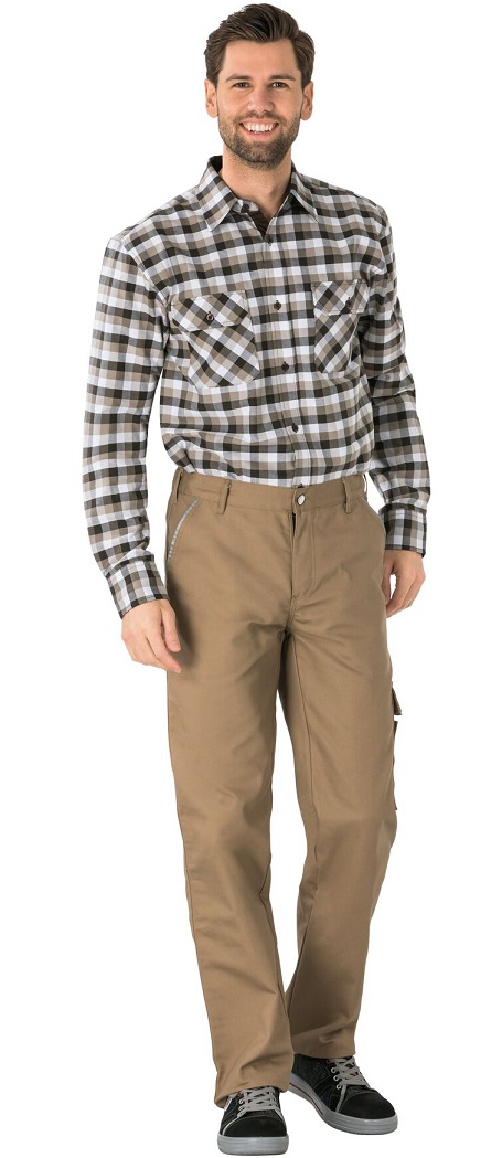 2 set-in pouch pockets, right double ruler pocket, reflective piping at the pocket openings and the pocket flaps, left thigh pocket with flap and press studs, attached mobile phone pocket, elasticated waistband, right 1 reinforced hip pocket, round waistband with 7 belt loops and jeans button, zipper in trouser fly.
