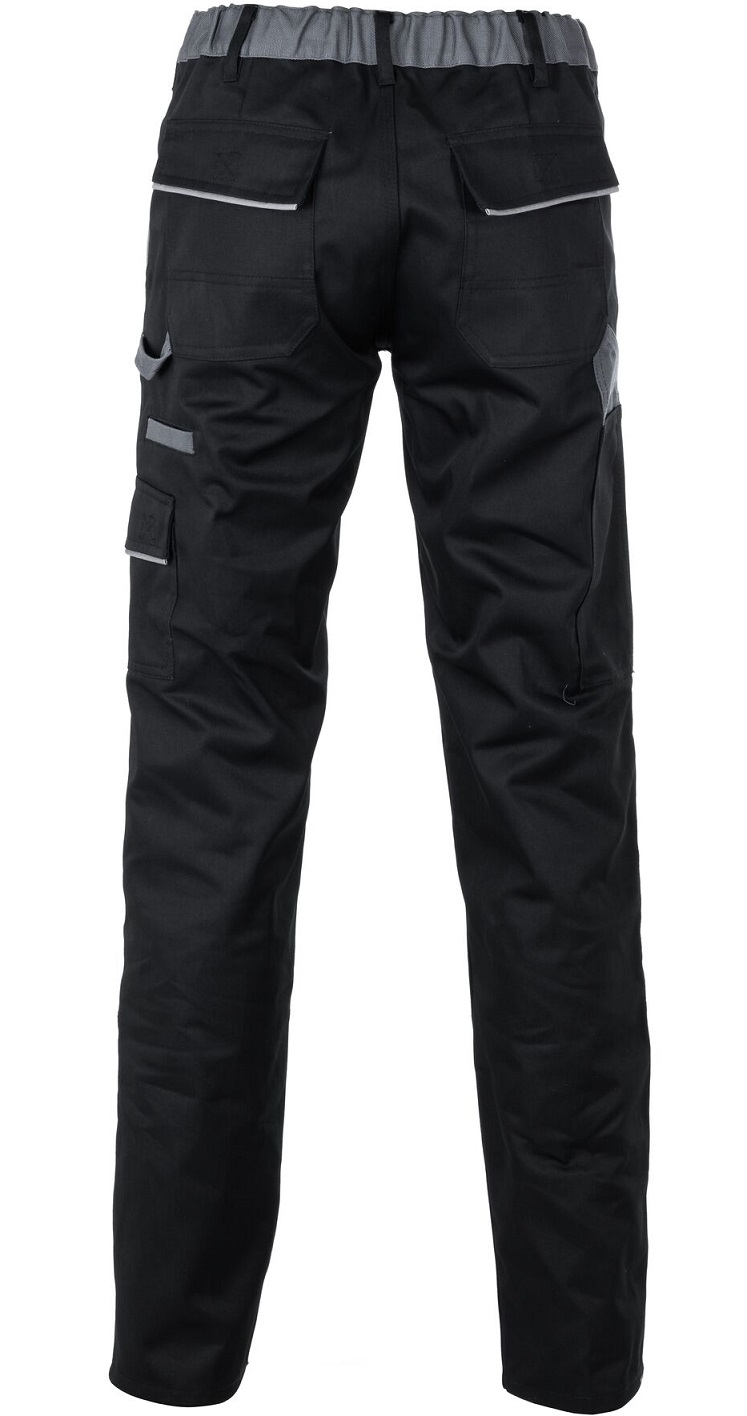 This article is certified as knee protection according to EN 14404 Type 2, Level 1 in combination with a knee PLANAMpad (Art.-No. 9901027). 2 set-in pouch pockets, 2 patch knee pockets with coloured applications, double ruler pocket, left thigh pocket with flap and Velcro fastener, elastic waistband, 2 hip pockets with flaps, zipper in trouser fly, pocket openings and pocket flaps with coloured piping.