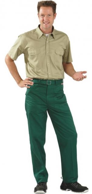 round waistband with 7 loops, belt with metal buckle, 2 patch front pockets, reinforced, 1 back pocket, 1 ruler pocket.