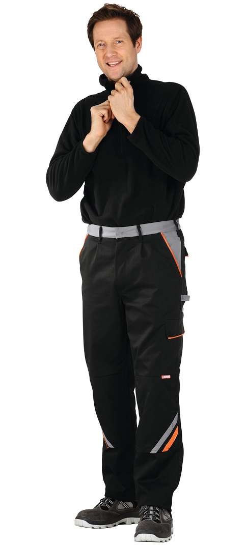 This article, in combination with a knee PLANAMpad (art. no. 9901027), is certified as knee protection according to EN 14404 type 2, level 1. 2 set-in pouch pockets, 2 patch knee pockets with coloured applications, double ruler pocket, left thigh pocket with flap and Velcro fastener, mobile phone pocket, elasticated waistband, 2 hip pockets with flaps, zip in fly, pocket openings and pocket flaps with coloured piping.