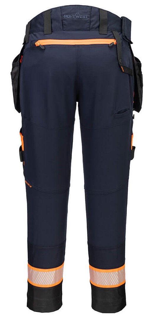 The DX4 ladies' waistband trousers with detachable high-vis holster are ergonomically designed and use the targeted placement of dynamic 4X stretch fabrics to ensure maximum freedom of movement when working. The trousers have a raised back waistband with elasticated sides to ensure protection in all working positions. Triple stitched seams for maximum durability.