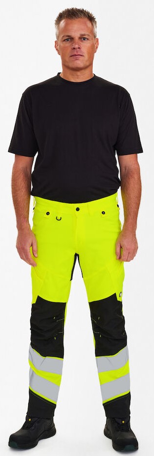 Stretchy, functional and fluorescent trousers in a modern design. Optimum fit with ergonomically shaped knee area. The stretchy fabric ensures optimum freedom of movement and comfort. D-ring at the front for attaching ID cards, for example. Two spacious slanted front pockets. Two back pockets. Two thigh pockets with zippers. The left thigh pocket has an additional cell phone pocket. The right thigh pocket has an attached reinforced ruler pocket with additional dividers. Knee reinforcement/knee pocket with Velcro fastener at the bottom and made of CORDURA® material. Reflective stripes on the lower leg. Wide bottom hem that can be left out if extra leg length is required. Only one seam needs to be undone to lengthen the trousers. The trouser leg is still hemmed. Clothing class 2, tested after 50 washes.