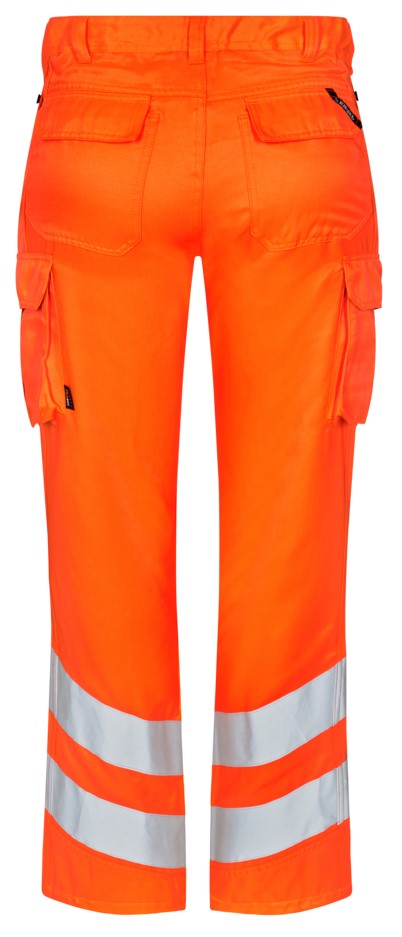 Functional fluorescent trousers in a modern design. Optimum fit with ergonomically shaped knee area. The fabric is hard-wearing and breathable and is made from 50% recycled polyester. The elastic waistband at the back ensures a good fit and a secure fit of the trousers. D-ring at the front for attaching ID cards, for example. Two spacious slanted front pockets. Two back pockets with flap and Velcro fastener. Two thigh pockets with Velcro fastener. The left thigh pocket has an additional cell phone pocket and an inside pocket, e.g. for a walkie-talkie. The right thigh pocket has an inside pocket for a folding rule, for example. Knee reinforcement/knee pocket with Velcro fastener at the bottom and made of CORDURA® material. Reflective stripes on the lower leg. Clothing class 2, tested after 50 washes.