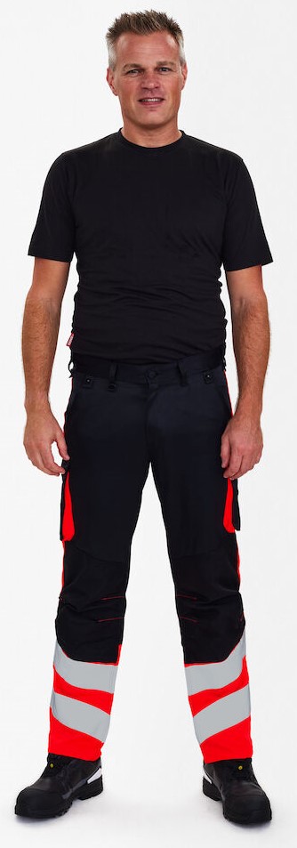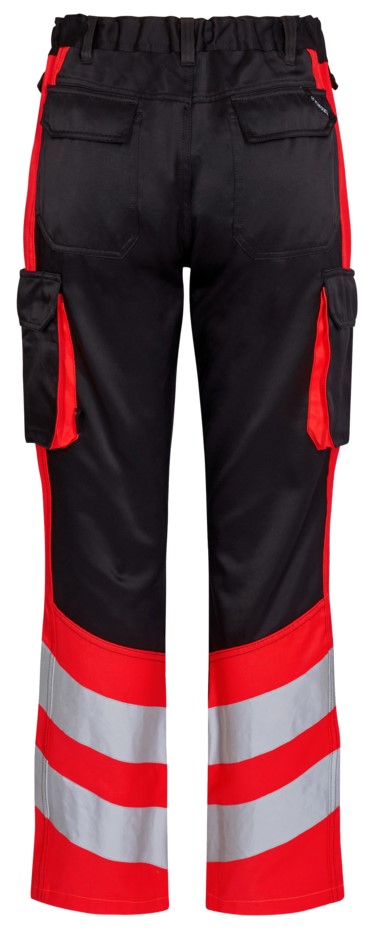 Functional and fluorescent trousers in a modern design. Optimum fit with ergonomically shaped knee area. The fabric consists of 50% recycled polyester, which contributes to a durable and breathable quality. The elastic waistband at the back ensures a good fit and a secure fit of the trousers. D-ring at the front for attaching ID cards, for example. Two spacious slanted front pockets. Two back pockets with flap and Velcro fastener. Two thigh pockets with Velcro fastener. The left thigh pocket has an additional cell phone pocket and an inside pocket, e.g. for a walkie-talkie. The right thigh pocket has an inside pocket for a folding rule, for example. Knee reinforcement/knee pocket with Velcro fastener at the bottom and made of CORDURA® material. Reflective stripes on the lower leg. Clothing class 1, tested after 50 washes.
