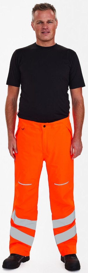 Fluorescent, breathable, waterproof and windproof winter trousers with taped seams. Two front pockets with Velcro fastener. D-ring at the front for attaching ID cards, for example. Extra high lumbar area and adjustable elasticated waist for maximum comfort. Concealed two-way zipper on the legs that allows access to the inner garment and snow guard/wind guard on the legs. Reinforced knees. Reflective stripes on the lower leg. Clothing class 3, tested after 50 washes.