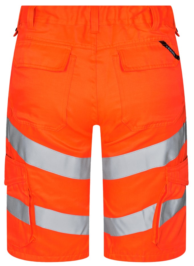Functional, fluorescent shorts in a modern design. The fabric is made from 50% recycled polyester, which contributes to the durable and breathable quality. The elastic waistband at the back ensures a good fit and a secure fit of the shorts. D-ring at the front for attaching ID cards, for example. Two spacious slanted front pockets. Two back pockets with flap and Velcro fastener. Two thigh pockets with Velcro fastener. The left thigh pocket has an additional cell phone pocket and an inside pocket, e.g. for a walkie-talkie. The right thigh pocket has an inside pocket for a folding rule, for example. Reflective stripes on the thigh. Clothing class 1, tested after 50 washes.