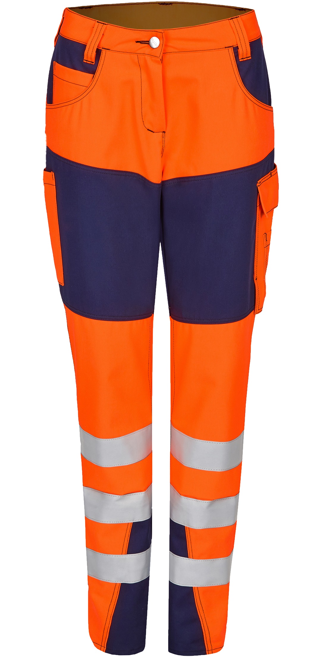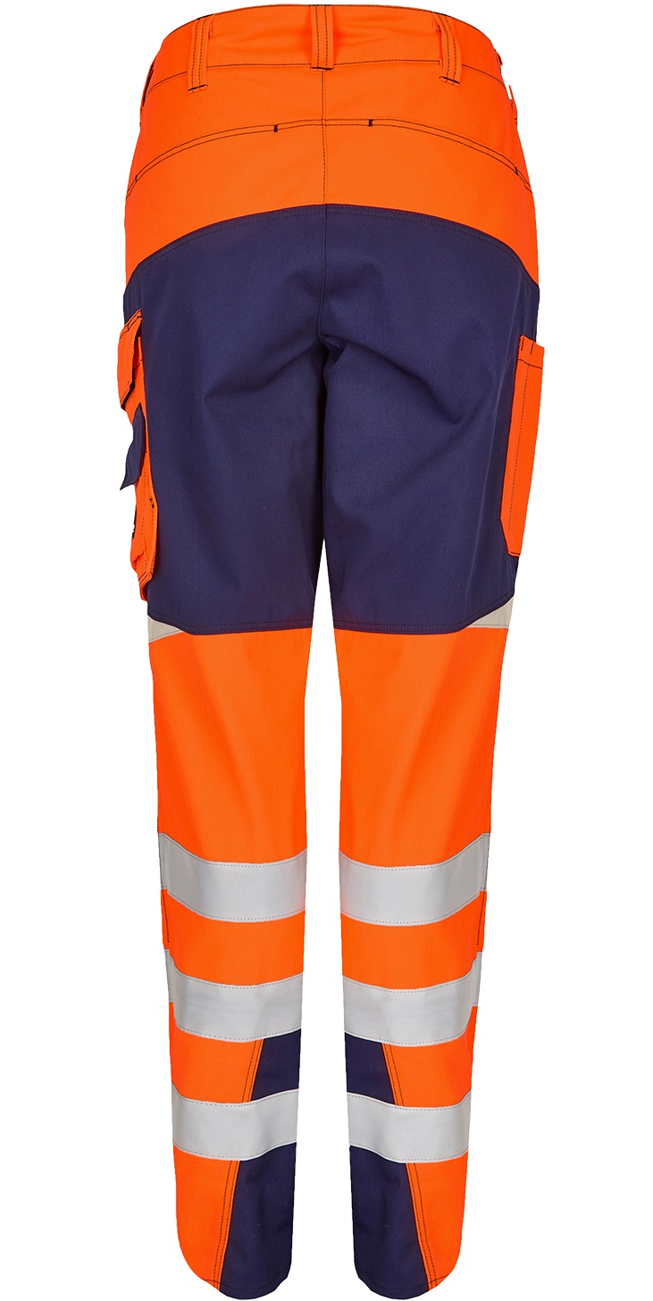 The rofaWARNSCHUTZ NEWLINE waistband for ladies meets the standard for high visibility warning clothing and makes the wearer visible all around, even in poor visibility and darkness. The material is particularly tear and abrasion resistant as well as water, oil and dirt repellent. Striking contrasting design elements and the intelligently placed reflective stripes on the trouser leg create a modern and dynamic appearance. The ergonomic cut and the pleasantly soft material grip ensure a high level of wearing comfort. Integrated knee pockets for upholstery protect the knees even under heavy use. Innovative pocket solutions offer sufficient storage space and can be used individually.Purpose: High visibility warning clothingProduct features: FC (water-repellent)Material: fabric 275 satin, 65% polyester, 35% cotton, approx. 290 g/qm, FCavailable colours: 347-light orange-navyavailable sizes: D34-D50