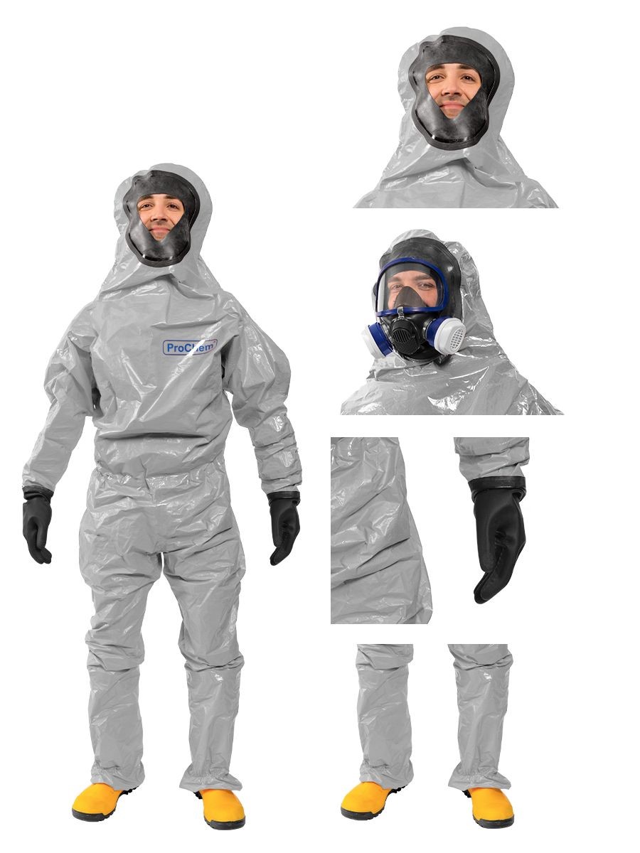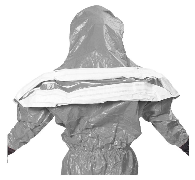 The suit is made from Tychem F, a lightweight, resistant material that provides a high barrier against the permeation of a wide range of chemicals and protects the wearer from numerous organic and highly concentrated inorganic chemicals. It is also antistatic.