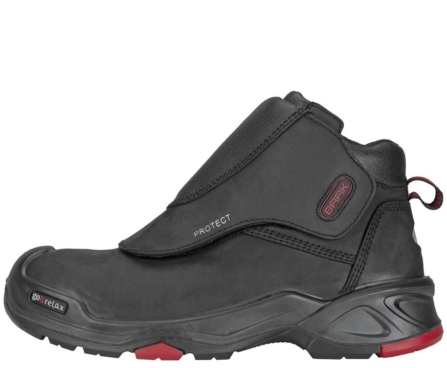 Robust safety welding boot with comfortable fit; EN ISO 20345 S3 WG HRO SRC HI; upper made of high-quality, full-grain LWG cowhide, combined with nappa leather, reflective applications; climate-regulating textile lining; particularly tear-resistant, robust and fireproof yarn; softly cushioning Baak PU-Softstep+ insole (orthopaedically adaptable), breathable with high moisture absorption and release, antibacterial; Baak® go&relax system for foot-appropriate flexing, consisting of Baak steel flex cap & coarse PU/nitrile sole with Baak flex zone in the ball area and integrated H-coupling element; PU overcap; outsole heat-resistant up to 300°C under short-term load; particularly slip-resistant; certified for orth. Certified for orthopaedic insoles according to DGUV regulation 112-191; steel flex toe cap for good toe clearance; textile, flexible penetration protection; size 38-48 in width 11