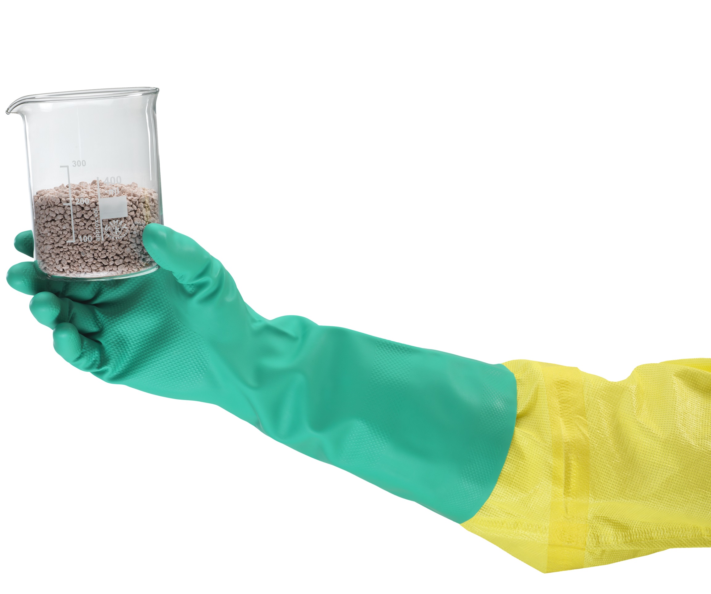 Ansell's Sol-Vex® nitrile glove range is available in a wide selection of lengths, wall thicknesses, sizes and linings. Sol-Vex® achieves optimum results in dry and wet work environments where superior chemical protection is critical. This reusable glove offers remarkable comfort with its uniquely high abrasion resistance. Sol-Vex® nitrile gloves are the ideal choice for safe handling of aggressive chemicals. The cotton velour lining, combined with the flexibility and dexterity of Ansell nitrile rubber, provides the user with exceptional comfort. Its diamond finish enhances grip. The Sol-Vex®'s hammer-blow profile, with its non-slip surface, reduces the scrap of sensitive parts due to damage and thus indirect costs. The Sol-Vex® model (37-695) is longer (38 cm) than the standard version and additionally protects the wrist and forearm.