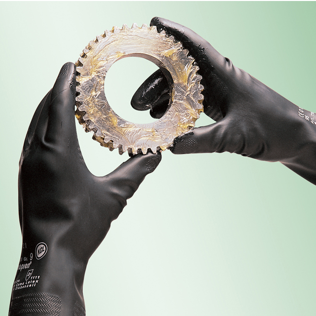Proven raw material with good properties in chemical and mechanical resistance. A more durable alternative to natural latex. The anatomical shape allows fatigue-free working. Good flexibility and pronounced palm profile allow best tactile feel and secure grip. Cuff, profiling, velourised. The fields of application are chemical industry, food processing industry, laboratory, electroplating.