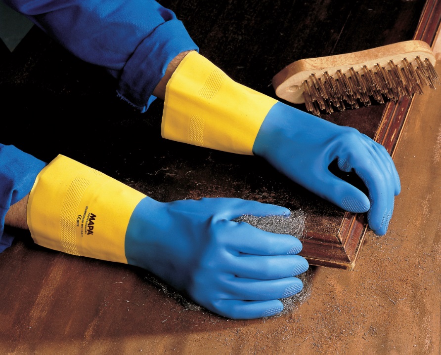 The MapaDuo-Mix 405 is made of a flexible material for excellent tactile sensitivity and excellent dexterity. Good chemical and mechanical resistance due to latex mix. Good grip due to non-slip profile. Wear comfort and sweat absorption. Application: Routine work in the chemical industry, cleaning and maintenance work, surface treatment.
