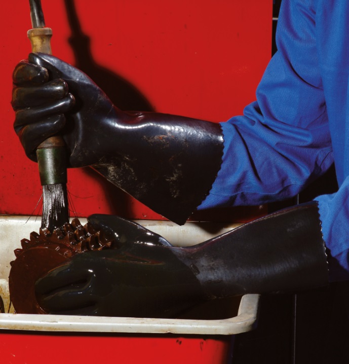 Liquid-tight chemical protective glove. Application Degreasing of metals, stripping, production of paints/varnishes/resins/adhesives, working with solvents, electroplating, handling of chemicals, printing industry, chemical accidents (emergency glove).