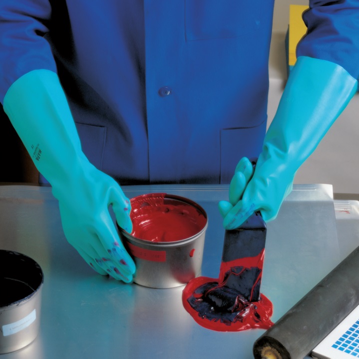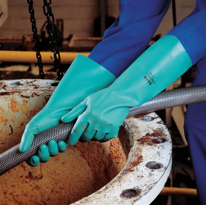 Protective glove with high level of protection against solvents, abrasion and puncture. High tactile sensitivity and mechanical resistance and resistance to hydrocarbon derivatives. Application Processing of cutting oil, treatment of metals with solvents, degreasing of metals, production and application of lacquers and paints, maintenance work.