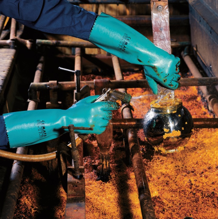 The latest technologies have been used to ensure a high level of protection against chemicals. Anatomically adapted by curved finger shape. Application Industrial cleaning, production of paints and varnishes, mineral oil transport, cleaning of printing presses, surface treatment, engine construction, production of machine tools, cleaning of hydrocarbon tanks, handling and transport of chemicals.
