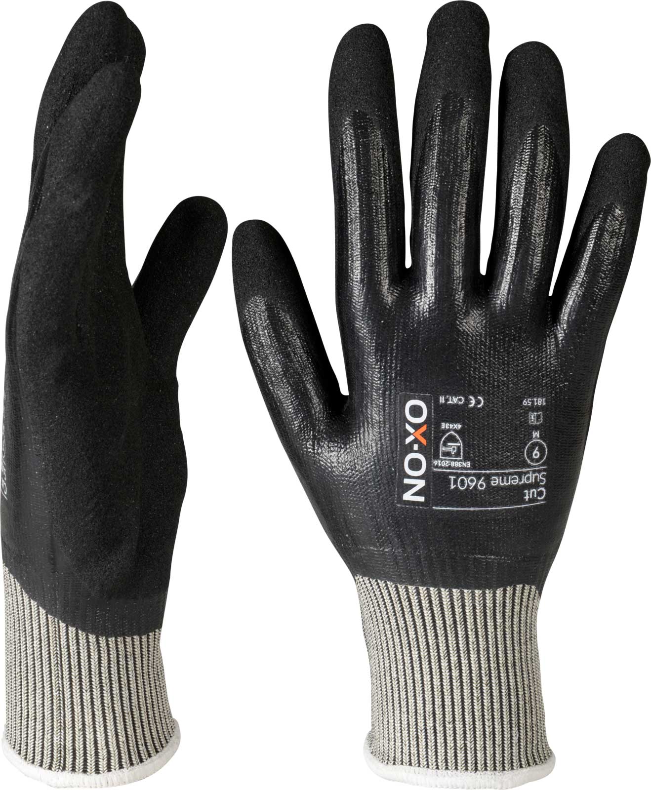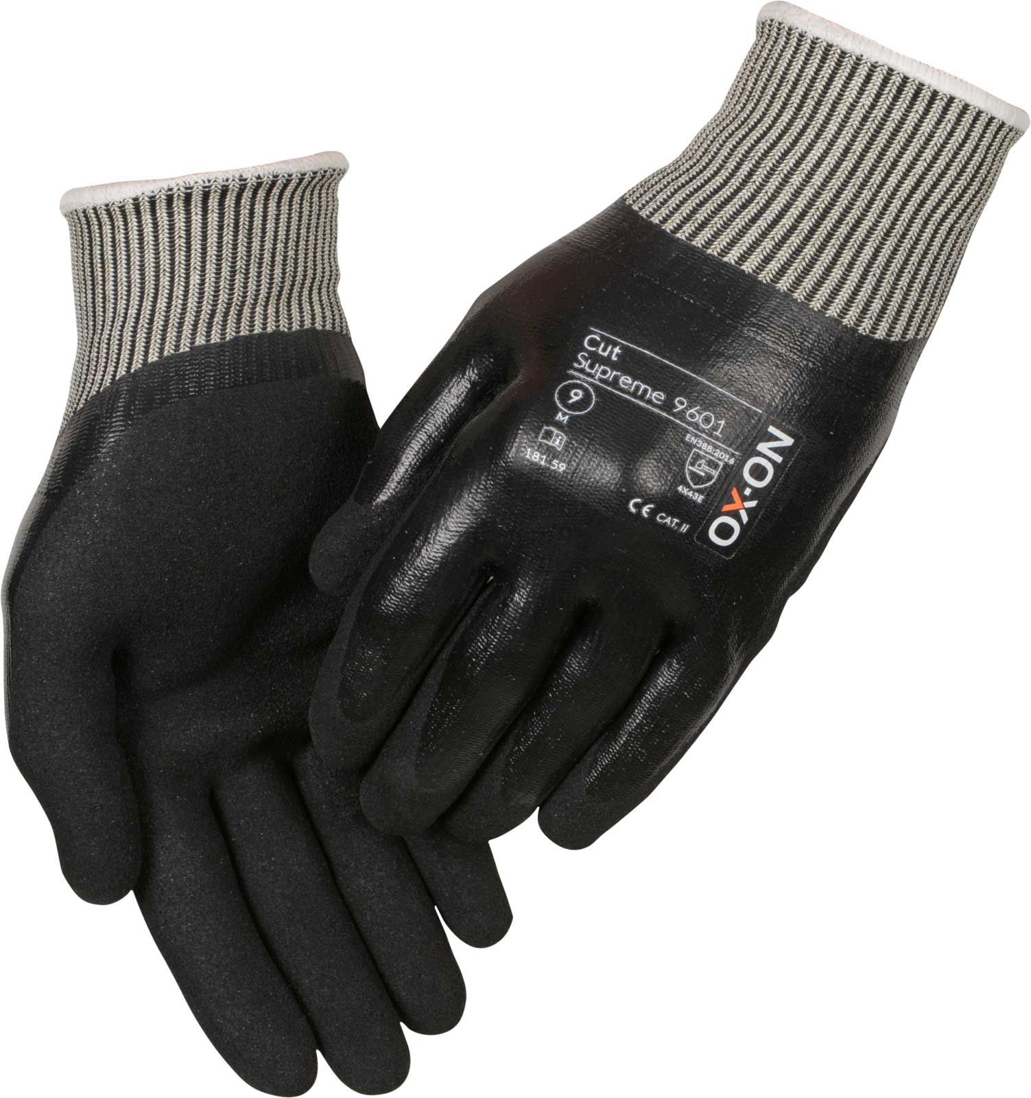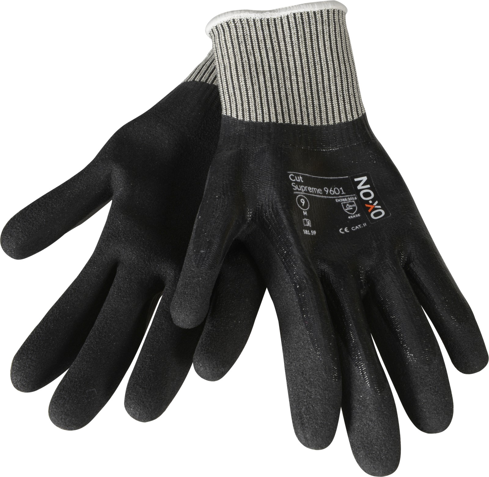 The OX-ON Cut Supreme 9601 is a 100% waterproof and extremely cut-resistant glove (class E) for mechanics, glaziers, blacksmiths or industrial workers, garbage workers or fitters with the highest demands. This glove is characterised by the fact that it has been double dipped. The lower layer seals it against water, oil and other liquids, so you can use the cut-resistant glove perfectly for work in damp environments. The outer layer is made of Sandy Nitrile, which gives you a precise and secure grip. The Cut Supreme 9601 is made of nylon and polyester, which makes it extremely durable. In addition, the glove has a particularly high percentage of elastane, which gives you even more suppleness and flexibility compared to similar cut protection gloves on the market. The glove stands out from other cut-resistant gloves because it contains High Performance Polyethylene (HPPE), which is exceptionally cut-resistant. With the Cut Supreme 9601 you get the best in safety and comfort.