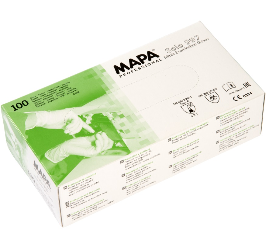 The MapaSolo Blue 997 is a resistant disposable protection for precision work and short-term use to the liquid-tight. High mobility and excellent tactile sensitivity. More grip due to grained fingertips. Good fit on the arm. Comfortable to put on and take off. Not suitable against mechanical stress. Ideal for precision work in oily environments. Applications: food processing, laboratory, pharmaceutical and cosmetic production, handling of small parts, work in the electrical industry, photographic work, nursing, graphic work, hair care.
