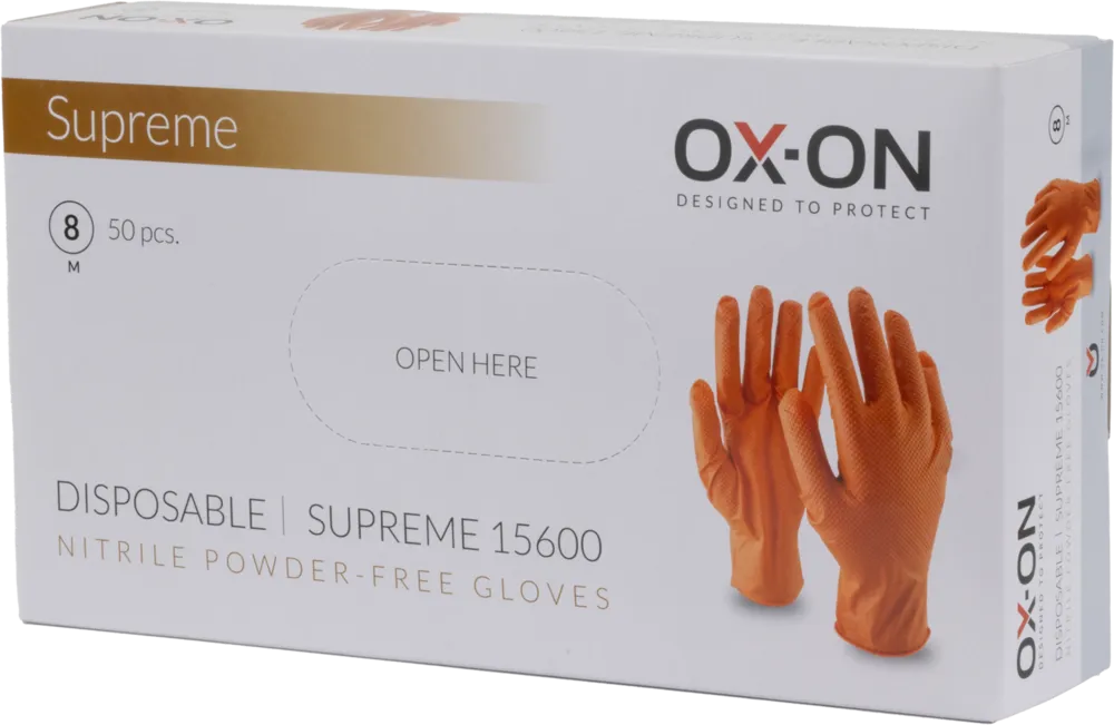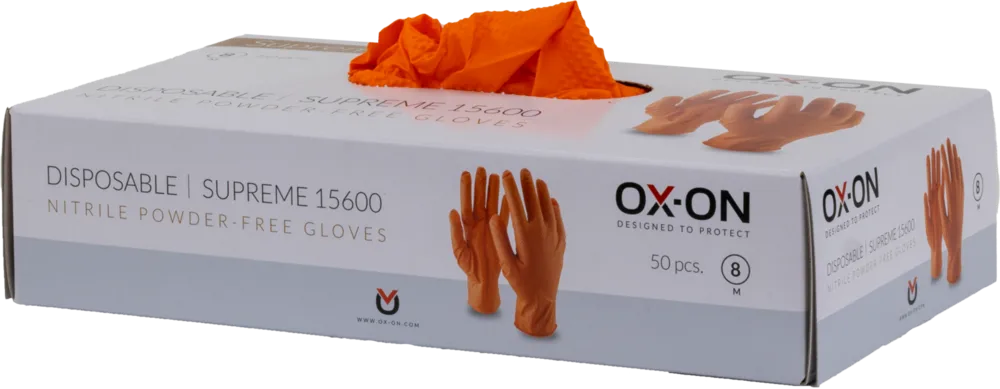 OX-ON Disposable Supreme 15600 are orange-coloured, powder-free disposable gloves made of extra-strong nitrile, with mini dots that increase durability. Extremely comfortable, elasticated disposable gloves that adapt 100% to the shape of the hand. Can be used, for example, for handling food, for cleaning work, for work in the workshop and for laboratory work. The glove is hypoallergenic as it contains no latex. Disposable Supreme 15600 are particularly robust, durable disposable gloves. 50 pcs. per box. Weight: 6.5 grams Thickness: Palm: 0.18 mm (+/- 0.03) Fingers: 0.20 mm (+/- 0.03) Cuff: 0.08 mm (+/- 0.03)