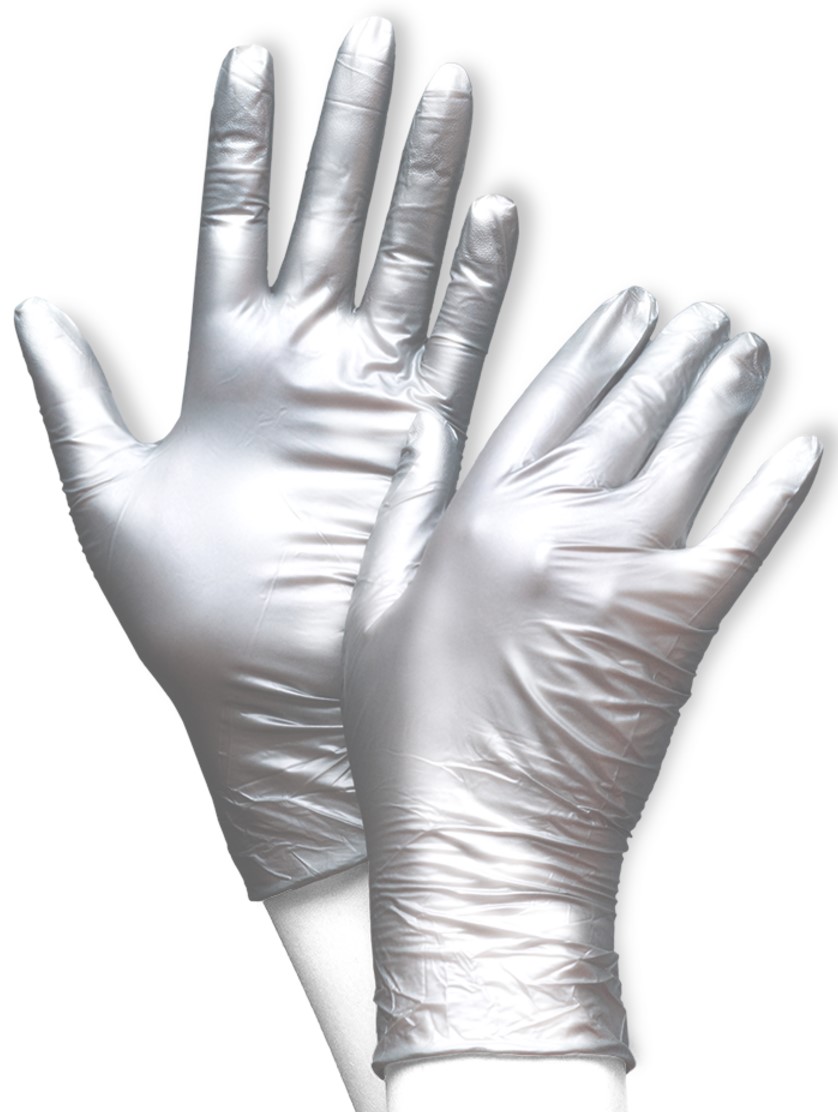 Fancy is not only an expression for something unusual, but also for our FANCY glove. This eye-catching disposable glove will cause a stir in the hospitality industry, lifestyle segment as well as in the medical sector . Its glossy appearance will be a highlight for your hands. Of course, the glove complies with the PPE Regulation (EU) 2016/425 and the European standards EN 374, EN 420 and EN 455. The roughened fingertips ensure optimal grip during use and ambidextrous use is given by the universal fit. The waterproof material not only protects against moisture, but also against viruses, fungi and bacteria. In addition, the FANCY glove is suitable for use with food. Product description: Standards: MD, EN 374-1 Type-C, EN 455 T 1-4, CE, food safe. Material: nitrile length: 240 mm AQL: 1,5 non-sterile rolled edge powder-free micro-roughened fingertips color: silver shiny sizes: XS (5,0-6,0), S (6,0-7,0), M (7,0-8,0), L (8,0-9,0), XL (9,0-10,0) PU: 1 carton= 10 boxes a 100 pieces