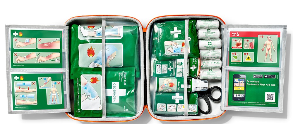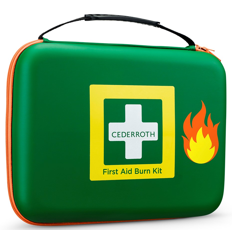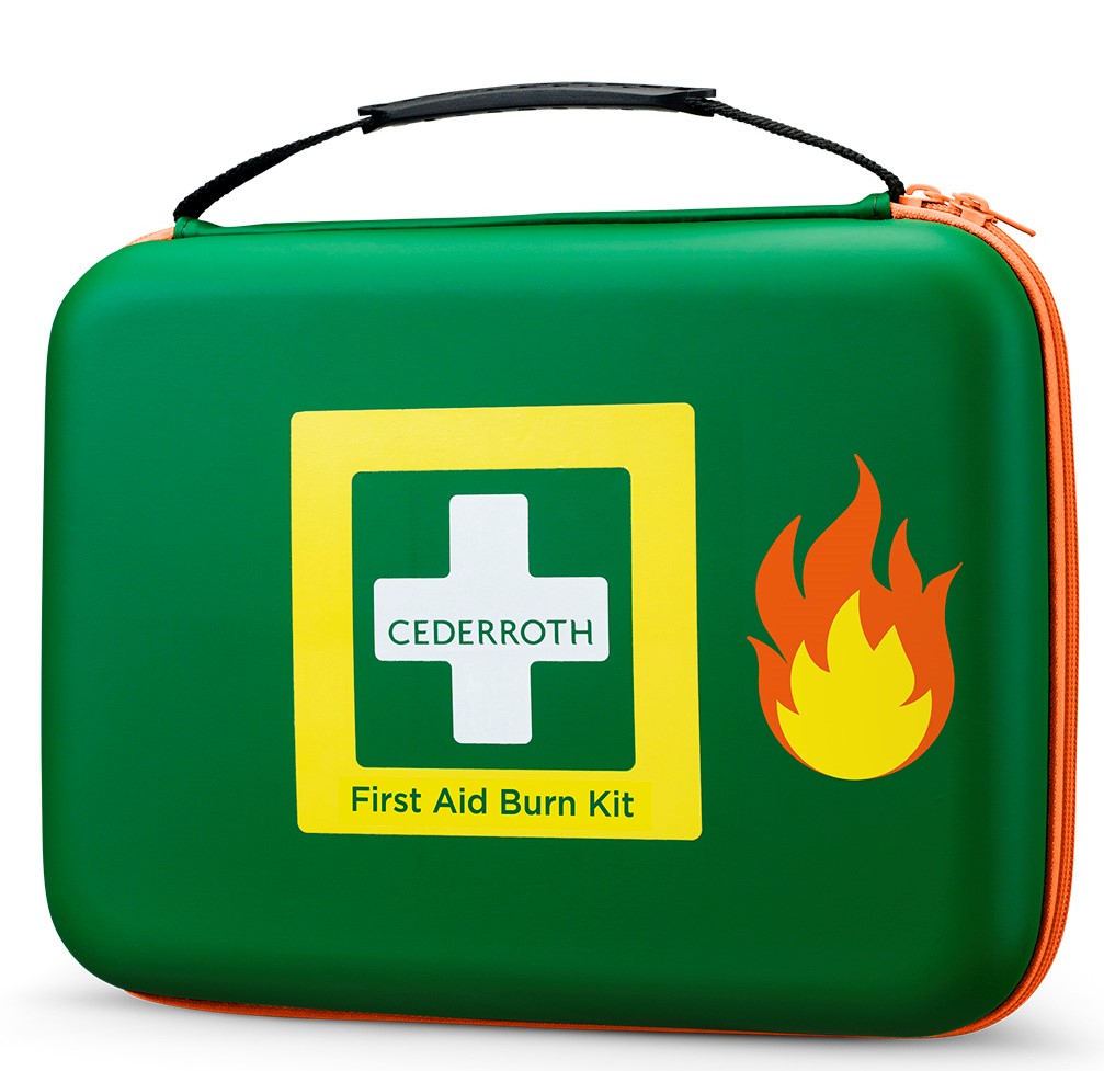 Contents: 1 Burn Gel 100 ml (REF 51011005), 1 Burn Gel Dressing/Face Mask 30×40 cm (REF 51011014), 2 Burn Gel Dressing 20×20 cm (REF 51011015), 4 Burn Gel Dressing 10×10 cm (REF 901900), 1 Cederroth 4-in-1 Hemostatic Dressing (REF 1910), 1 Mesh Dressing, 6 Elastic Fixation Bandages, 2 pairs of Gloves, 1 Scissors (REF 270002) 1 First Aid Guide and 1 Burn Guide.