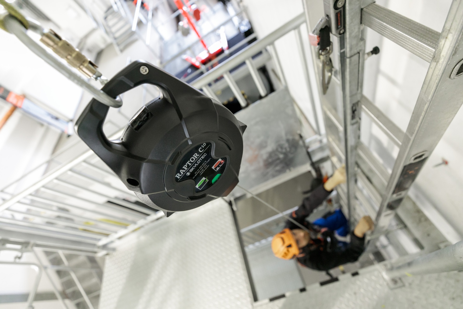 The RAPTOR CS retractable lifeline with self-retracting stainless steel cable and automatic locking function enables safe working at height and depth. RAPTOR CS has a modular design so that all components can be replaced individually, which reduces inspection times and maintenance costs. An energy-absorbing shock absorber protects the device housing and the internal mechanics, reducing continuous shocks and preventing hand injuries when pulling in the rope. The fall arrester has two fall indicators visible to the user, which indicate the functionality of the device from the outside. A red indicator warns the user as soon as the device needs to be checked. This protects the user from a device that is no longer operational and also saves time during the mandatory annual inspection. The well thought-out housing design also enables space-saving and device-friendly storage.